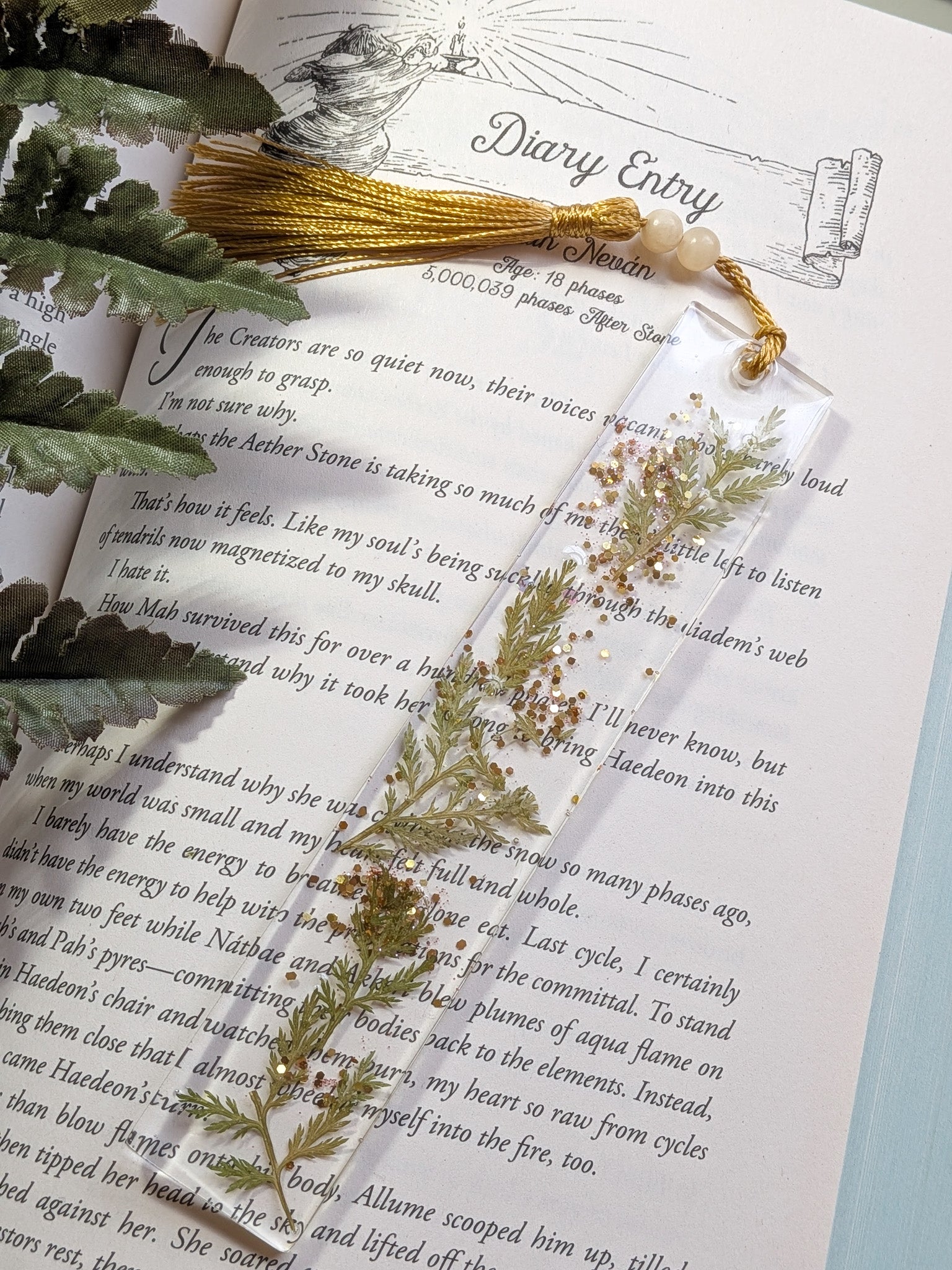 NOTE: This bookmark has some bumps where the leaves poked through slightly. The price has been adjusted for minor imperfection. Bookmarks are handmade and may feature slight variations or minor imperfections such as small bubbles or subtle texture differences, making each piece uniquely one of a kind.